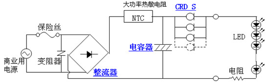 圖中的CRD就是恒流二極管,圖上采用了幾個(gè)CRD并聯(lián),以得到所需的恒流值,實(shí)際上現(xiàn)在有很多不同恒流值的恒流二極管可供選用,所以也不需要采用并聯(lián)的方法來得到所需的恒流值了。所以只要采用一個(gè)恒流值相當(dāng)?shù)暮懔鞫O管和所有LED凈化燈相串聯(lián)就可以實(shí)現(xiàn)對(duì)LED的恒流供電,可見它的電路是十分簡(jiǎn)單的!