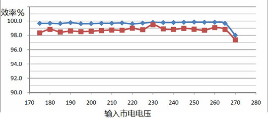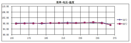 由圖中可以看到,當(dāng)環(huán)境溫度從35度升高到85度時(shí),整個(gè)效率隨輸入電壓變化曲線幾乎完全一樣,始終保持在98%以上(包括了整流器的效率在內(nèi))。