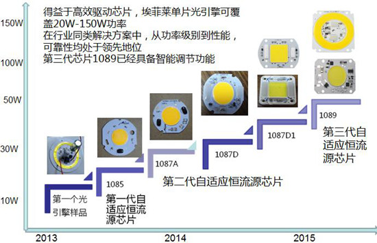 這種智能型LED凈化燈恒流源徹底打破了教科書里描述的線性恒流源效率很低的常規(guī)認(rèn)識(shí),而破天荒地實(shí)現(xiàn)了99%的效率。從而可以實(shí)現(xiàn)把恒流源和光源放在同一塊鋁基板上,而做成光電一體化的光引擎。因?yàn)樗旧淼墓臉O低,所以把它放到光源的鋁基板上不會(huì)增加LED的結(jié)溫。深圳埃菲萊公司采用這種智能型恒流源已經(jīng)生產(chǎn)了一系列不同功率的光引擎:
