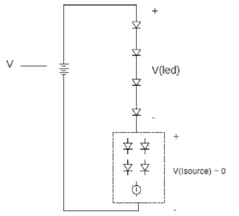 其中方塊中的這部分LED就是可以自適應(yīng)地接入到主串LED中,也可以從主串中自適應(yīng)地?cái)嚅_。接入或斷開的個(gè)數(shù)由輸入電壓變化的大小而決定。它能感知輸入電壓的變化,并由此來決定LED數(shù)目的變化,所以它是自適應(yīng)的,也可以說是智能的。