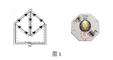 AC LED可分為兩類:一類是由單芯片封裝,芯片上多有個(gè)LED單元串聯(lián),并利用部分LED單元組成整流路,實(shí)現(xiàn)交流發(fā)光。參見(jiàn)圖一。