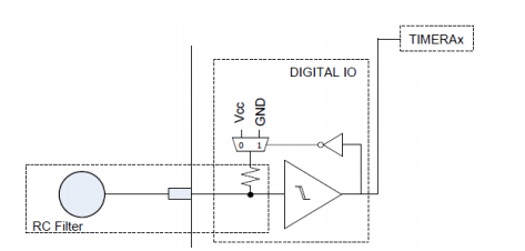 MSP430根據(jù)型號的不同支持多種電容觸摸檢測方式,有RC 震蕩、比較器、PIN RO,本設(shè)計使用的是PIN Relaxation Oscillator 方式,原理如圖,芯片管腳內(nèi)部檢測電路由施密特觸發(fā)器、反向器,以及一個電阻組成,震蕩信號經(jīng)過施密特觸發(fā)器變成脈沖信號,再通過反向器反饋回RC 電路,通過Timer_A對施密特觸發(fā)器的輸出進行記數(shù),再通過設(shè)置測量窗口Gate 獲得記數(shù)的結(jié)果。當(dāng)手指觸摸電極,電極上的C 產(chǎn)生變化,導(dǎo)致震蕩頻率改變,這樣在定長的測量窗口就能獲得不同的記數(shù)結(jié)果,一旦差值超過門限,結(jié)合一定的濾波算法判斷就可以觸發(fā)觸摸事件。