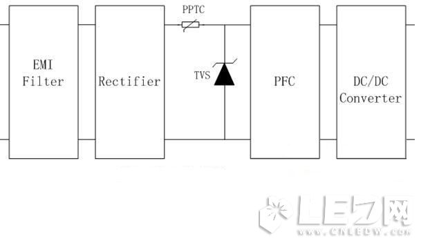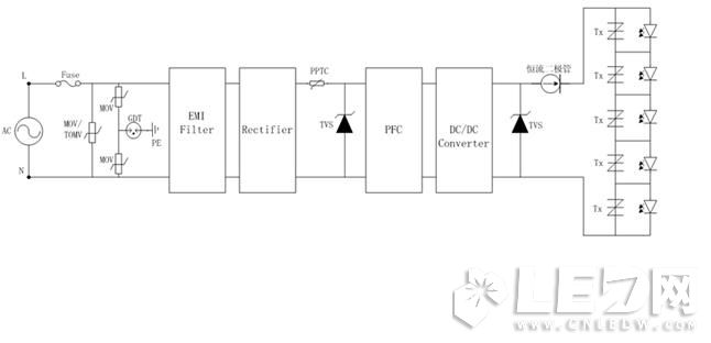 綜上所述, LED驅(qū)動(dòng)電路一般由AC輸入、整流,、DC/DC轉(zhuǎn)換、等模塊組成,從而一個(gè)LED驅(qū)動(dòng)電路大致整體的防護(hù)方案可以參考如圖6所示: