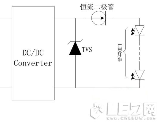 LED發(fā)光的亮度是由通過(guò)LED的電流大小來(lái)控制, 不穩(wěn)定的電流又極易燒壞LED,如圖4在DC/DC模塊后可以在電路中串聯(lián)恒流二極管來(lái)獲得穩(wěn)定的電流,,這樣不僅可以使LED獲得穩(wěn)定的亮度,,又不至于因電流的不穩(wěn)定而燒壞LED。低功率的LED凈化燈工作電流一般為10mA到30mA,大功率的LED燈工作電流從200mA到1400mA不等,可以根據(jù)所需要的工作電流選擇型號(hào)合適的恒流二極管。由于LED燈也易遭受到靜電放電過(guò)壓的干擾受損, 因此DC/DC電路后端的LED燈也需要做一定的有效過(guò)壓防護(hù),一般采用TVS管就可以。