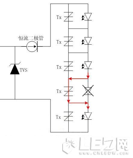 當(dāng)多個(gè)的LED燈通過(guò)串聯(lián)的方式進(jìn)行連接時(shí), 如圖5所示,一旦出現(xiàn)LED燈出現(xiàn)失效開(kāi)路故障,整個(gè)LED燈都會(huì)因?yàn)榇斯收隙绊懙狡渌麹ED燈正常工作,為了解決這個(gè)問(wèn)題, 可以針對(duì)每個(gè)LED燈上并聯(lián)一個(gè)防開(kāi)路的LED保護(hù)器件Tx,這樣就可充分的提高每個(gè)LED的使用效率,當(dāng)單個(gè)LED出現(xiàn)失效開(kāi)路故障時(shí), 與之并聯(lián)的LED開(kāi)路保護(hù)器件Tx會(huì)立即導(dǎo)通, 使之可持續(xù)的維持處于通態(tài),從而保證了電路中其它串聯(lián)的LED不因單顆LED的開(kāi)路故障而熄滅,但此防護(hù)措施成本相對(duì)比較高。