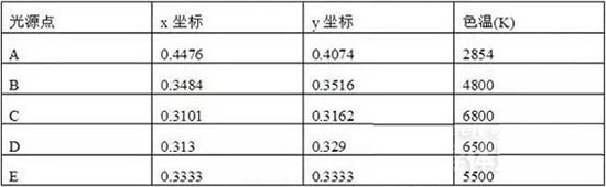 對(duì)于三原色紅(R)、綠(G)、藍(lán)(B),x=R/(R+G+B),y=G/(R+G+B),z=(R+G+B)。由于x+y+z=1,所以只需給出x和y的值,就能唯一確定一種顏色,這就是通常所說(shuō)的色度圖。若以若以x、y作為平面坐標(biāo)系,用比色實(shí)驗(yàn)法測(cè)出自然界中各種色彩的x、y值,并將其繪在該坐標(biāo)平面內(nèi),便可得到色度圖。該色度圖邊沿舌形曲線上的任一點(diǎn)都代表某一波長(zhǎng)光的色調(diào),而曲線內(nèi)的任一點(diǎn)均表示人眼能看到的某一種混合光的顏色。其中,白光區(qū)域的特征點(diǎn)A.、B、C、D、E的色坐標(biāo)值的色溫度值見下表。