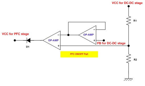 建議使用一種簡單的輔助電路,將PFC的工作與準(zhǔn)諧振反激DC-DC轉(zhuǎn)換器進(jìn)行同步,因?yàn)楫?dāng)DC-DC轉(zhuǎn)換器開始間歇工作時,PFC級也能夠進(jìn)入間歇工作模式。一旦第二級反激轉(zhuǎn)換器結(jié)束間歇模式工作,PFC級會立即退出間歇工作模式。圖1為該輔助電路的工作原理。PFC級的偏置電源受到準(zhǔn)諧振反激DC-DC轉(zhuǎn)換器反饋的控制。