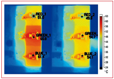 圖 6 和 Cree 公司的 LED 一起組裝的電路板散熱圖。左側(cè):無散熱片;右側(cè):有散熱片。