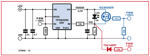 利用 PWM 進行調(diào)光作為一個示例,我們將會看到一些使用 TPS62260 實施 PWM 控制的方法。TPS62260 是一款同步降壓轉(zhuǎn)換器,其具有集成的開關(guān) 元件,典型的時鐘頻率為 2.25MHz。在圖 2 的電路中,我們以黑色顯示了將 PWM 信號直接連接至 EN(使能)引腳的可能性。整個開 關(guān)調(diào)節(jié)器電路和 PWM 信號一起開啟和關(guān)閉。在我們實驗中的試驗表明,在這種配置中,我們可以使用一個高達 100Hz 的 PWM 頻 率。這種排列的優(yōu)點是其簡易性:不需要額外的組件。另外,它還是最為高效能的實施方法,因為該開關(guān)調(diào)節(jié)器在關(guān)閉時僅產(chǎn)生非 常少的靜態(tài)電流。其缺點是,LED 對使能引腳上高電平的反應(yīng)被延遲。這是因為開關(guān)調(diào)節(jié)器具有一種“軟啟動”功能:當器件被開啟時 ,輸出電流逐漸上升,直到其達到額定的 LED 電流。在一些應(yīng)用中,這種上升斜坡可能會存在一些問題,因為 LED 發(fā)光的波長隨電 流從其最小值到正常工作電平的逐漸增強而變化。例如,在一個 DLP 投影儀或 LCD 電視面板的 LED 背光燈中,這種變化可能是我 們無法接受的。但是,就這個示范項目而言,肉眼無法看到這種影響。在第二個變量中(圖 2 中紅色所示部分),PWM 信號通過一個小信號二極管被耦合至 TPS62260 的誤差放大器輸入端。在本電路 中,一個施加于控制輸入端的超過 600mV 的正電壓會使誤差放大器輸入驅(qū)動過度,并由此關(guān)閉 LED。由于這個電路沒有使用使能 輸入,因此它不具有與調(diào)節(jié)器軟啟動功能相關(guān)的啟動延遲,且 LED 被極為快速地開啟和關(guān)閉。因此,上述電流斜坡所帶來的輸出波長變化在本結(jié)構(gòu)中小到可以被忽略不計。另外,我們在實驗室里發(fā)現(xiàn),PWM 頻率可以上升 到 5kHz。圖 2 中藍色部分顯示了第三種可能性。這里的 PWM 信號被用于控制線連至 LED 的 MOSFET。MOSFET 使 LED 短路,并允許其 被更加快速地開啟和關(guān)閉。該調(diào)節(jié)器運行在恒定電流模式中,而且電流將會流經(jīng) LED 或者 MOSFET。這種方法的一些缺點包括 MOSFET 帶來的額外成本以及低效能:在 2Ω 電流感應(yīng)電阻器中會有高達 180mW 的功率被不斷耗散掉。其優(yōu)點是較高的開關(guān)頻率: 在一些實驗中,我們看到 TPS62260 可以成功運行在 50kHz PWM 頻率的狀態(tài)下。