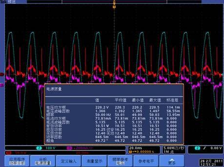 測量驅動電源的輸入功率、功率因數(shù)和諧波有很多方法,使用具有電源分析功能的示波器產(chǎn)品可以輕松實現(xiàn)這些電能質量測量。使用一路通道測量輸入電壓、一路通道測量輸入電流,配合示波器內置的PWR電源分析軟件,所有的電能質量相關參數(shù)可以直接顯示在屏幕中。