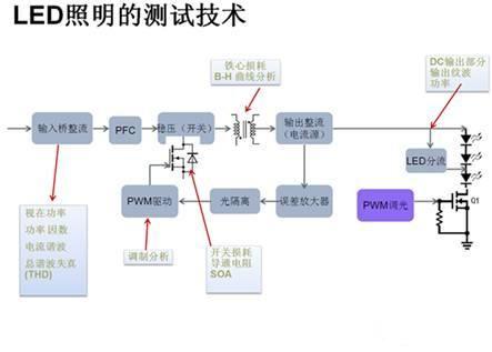 要達到高品質的驅動電源設計標準,就需要進行全面的測試測量分析,如圖1所示,LED凈化燈照明測試主要包括5個部分:電源質量、諧波、功率開關器件測量、調制分析以及驅動輸出參數(shù)測試。